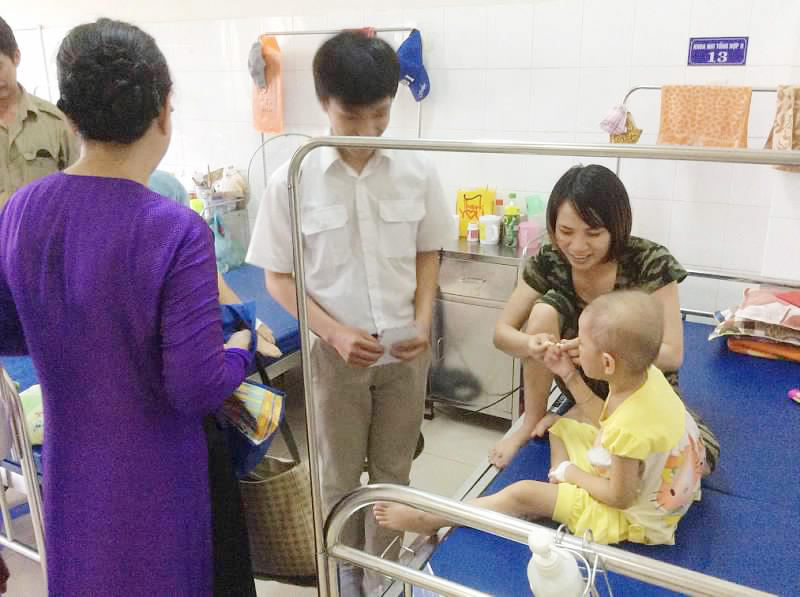 Nhìn sang những bậc cha mẹ,những người phải hằng ngày chứng kiến con của chính mình vật lộn với nỗi đau thể xác và đè lên vai họ là cả gánh nặng mưu sinh khi tất cả đã dồn cho việc chữa trị…và bay giờ,trước mắt con là hình ảnh một ông bố đang bế con ,ru cho nó ngủ..sau một hồi bắt chuyện,hỏi thăm con mới thấy hết được những khó khăn họ gặp phải.Đứa con vừa chào đời trong niêm vui tột cùng nhưng niềm vui ấy thật ngắn ngủi khi mà họ phát hiện ra con mình bị ung thư máu. Mọi thứ họ đều gom góp cho việc chữa trị bệnh cho con,nhà chỉ có hai lao động nay phải chia đôi,một người chăm sóc con, một người làm việc và giờ đây vợ anh ấy lại đang sinh tiếp đứa con thứ hai,,khó lại càng khó hơn gấp bội….. Và khi con trao sô tiền cho anh ấy,chú ấy đã nói một câu thật chua xót: “… chú à, có nhiều nhiều giúp đỡ thêm để tôi mua thêm sữa cho con…” Một người đàn ông đã sẵn sàng hạ mình xin sự giúp đỡ đủ thấy được họ khó khăn đến mức nào……….. nhìn một số đứa trẻ vui đùa hồn nhiên trong khi khó khăn dường như đã in hằng lên đôi mắt ba mẹ chúng mà tự nhiên chúng con thấy chạnh lòng,chua xót.