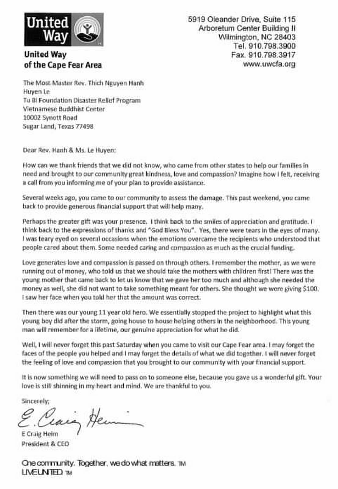 Dù sự thiệt hại quá lớn và sự đóng góp của chúng ta có khiêm tốn nhưng Hội đã thực hiện được theo sở nguyện của Hội và quý ân nhân: đến ủy lạo trực tiếp tại North Carolina, cuộc sống của người dân tại Wilmington rất khó khăn vì hầu hết là nông nghiệp và chăn nuôi xúc vật; trân bão đã gây thiệt hại 100%. Số tiền được ủy lạo như sau:
